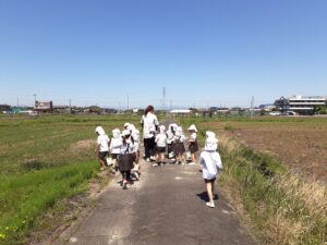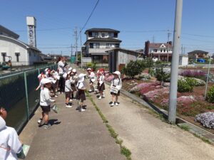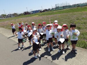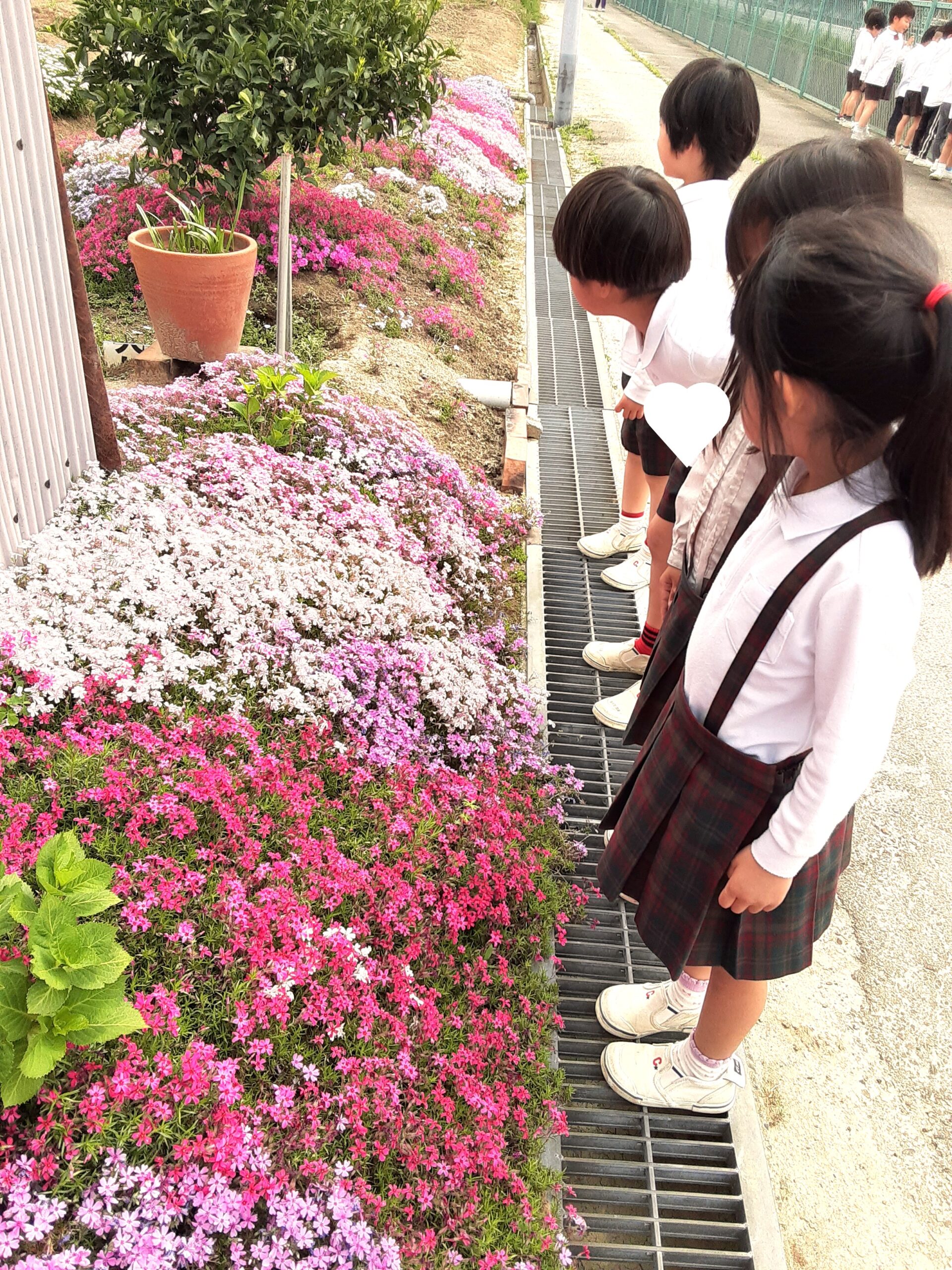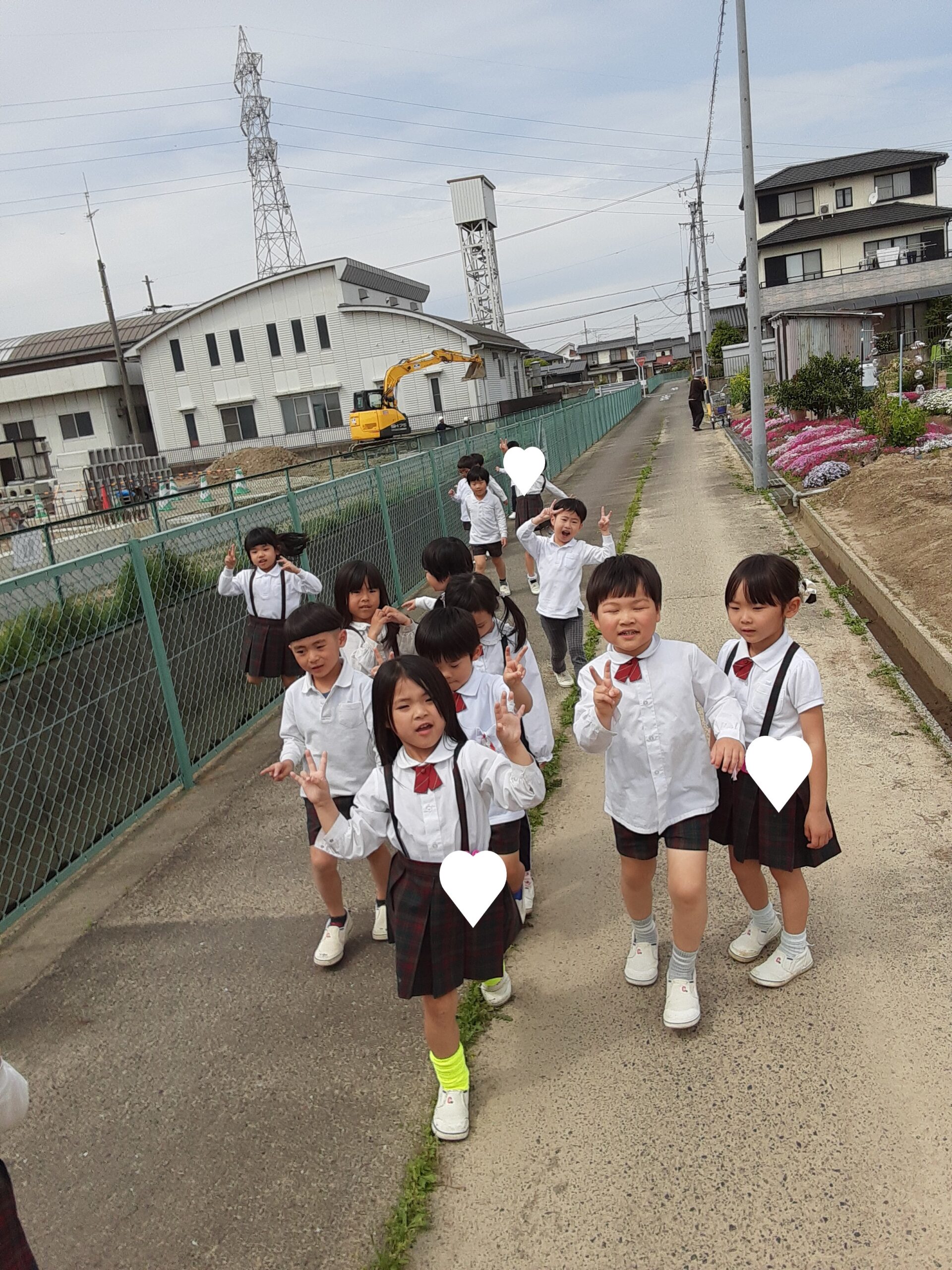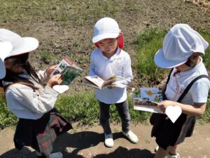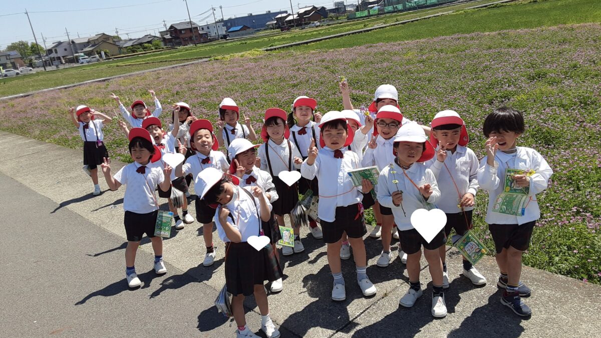 ブログ千秋幼稚園 千秋幼稚園の周りを🌺 春らしいとても暖かい日・・。 図鑑を持って、お散歩に出掛けました。 昆虫、草花。 興味津々です。 キャーッ!!と驚いたり、おおっ~!!となったり。 れんげ畑の前で・・。 空を見て・・ 近くに芝桜がきれいに咲いていました。 きれいだね。 鯉がいる~! 発見だらけで、忙しい子ども達。 年長さんの部屋の前の道。 自分の制作を飾ってあるのを見つけました🎵 たのしいお散歩でした!