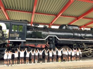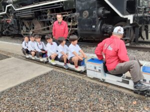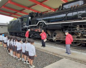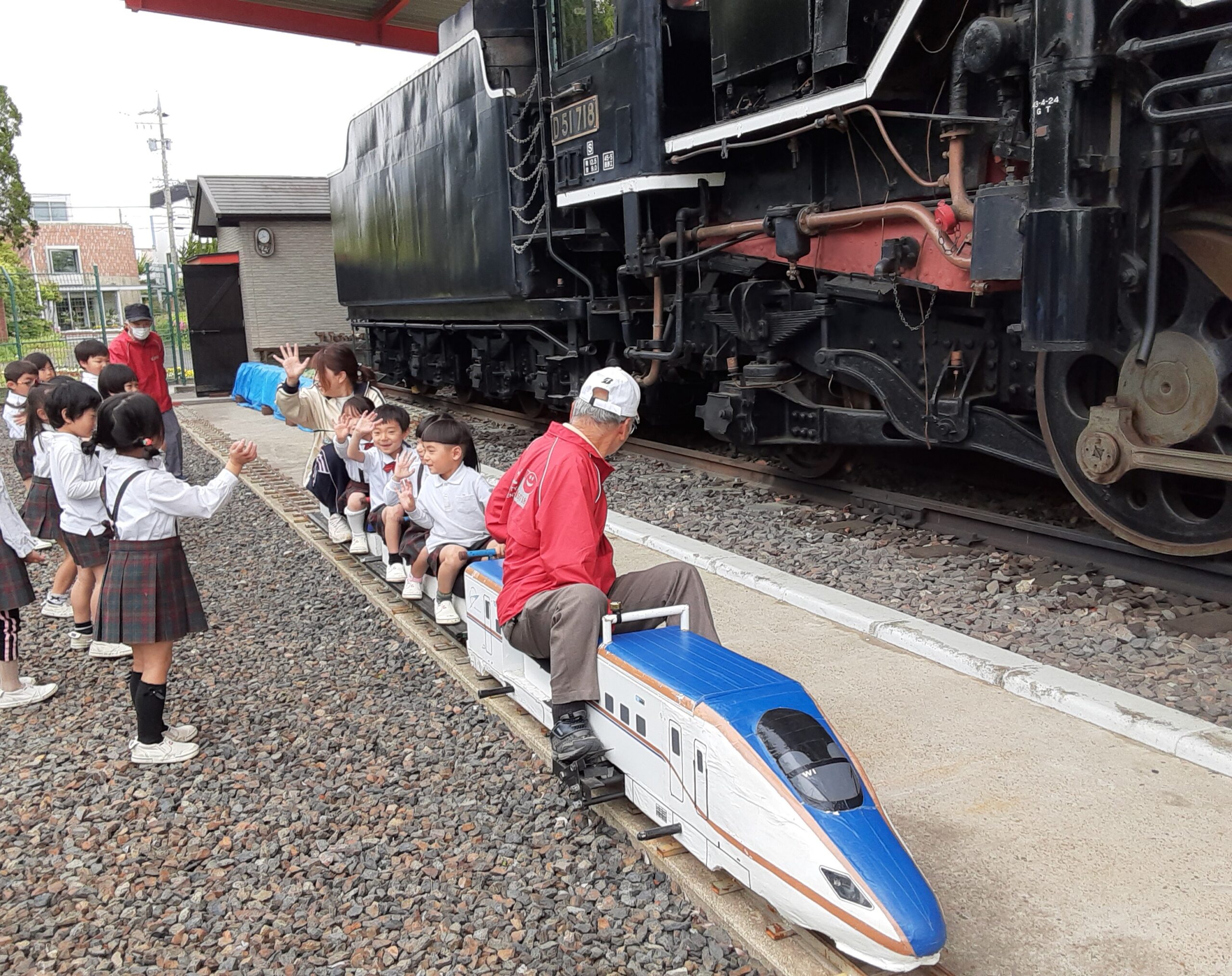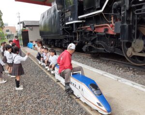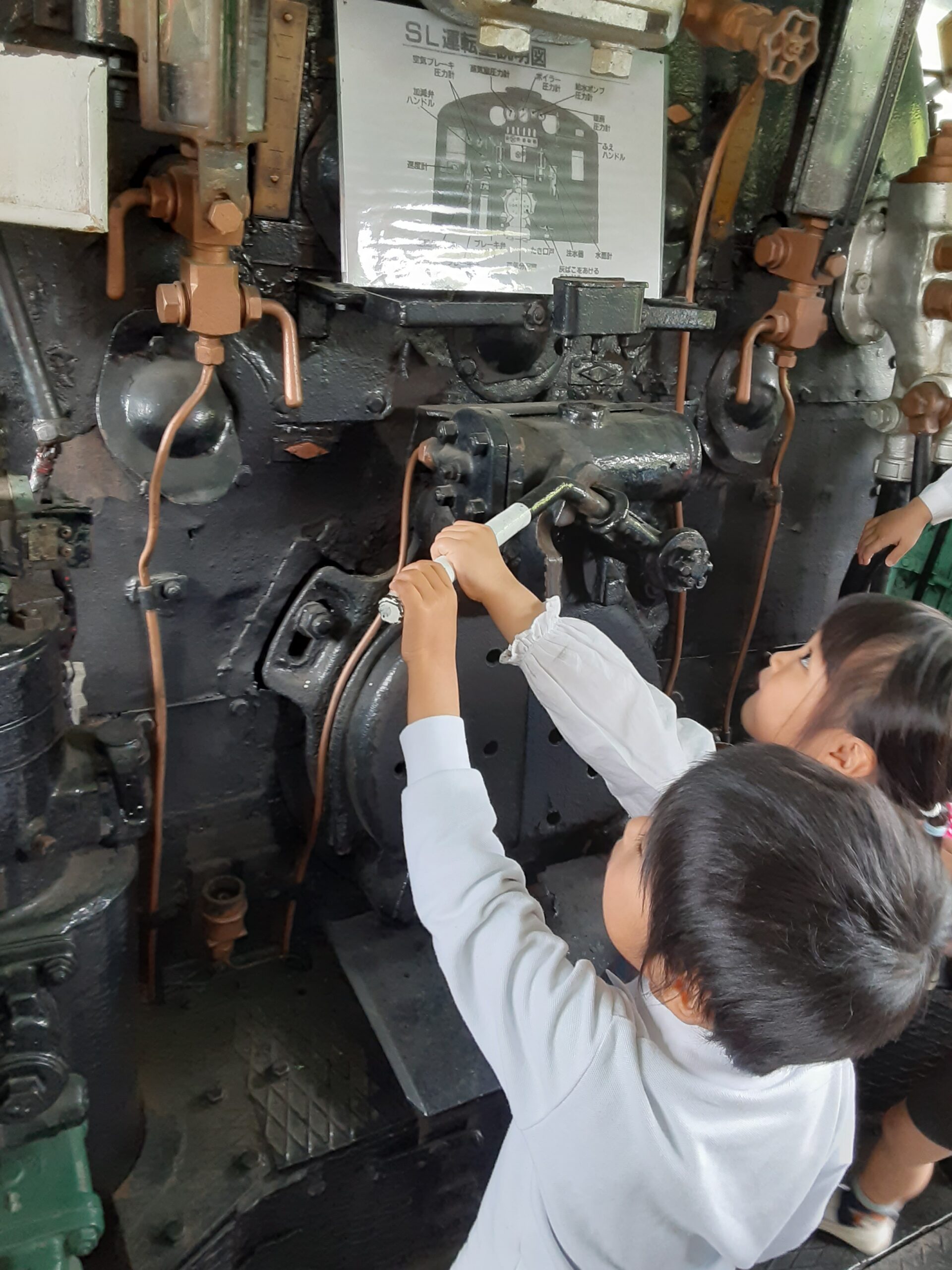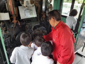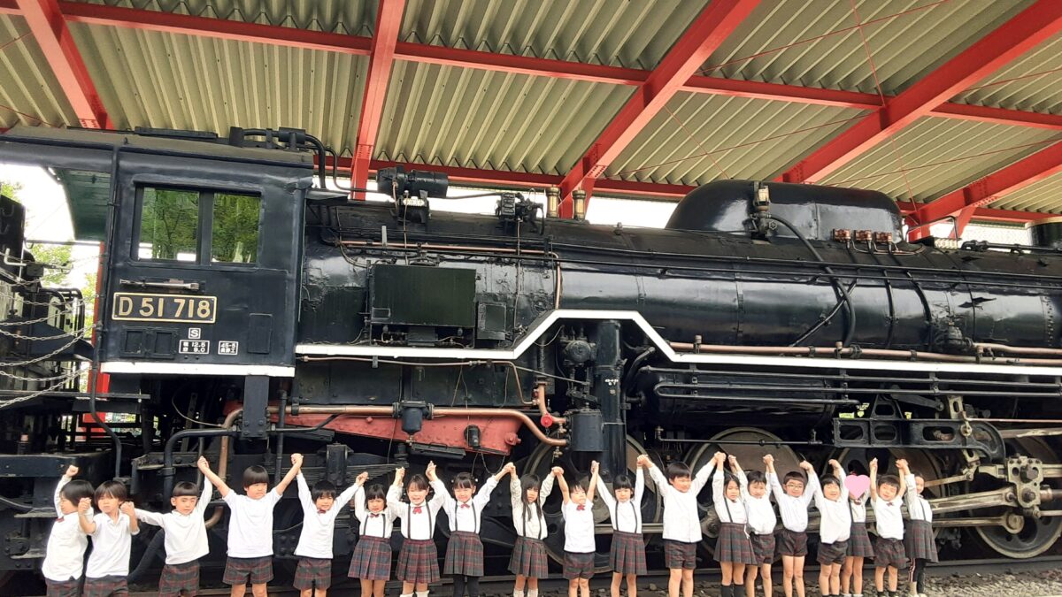 ブログ千秋幼稚園 蒸気機関車🚆千秋幼稚園 4月22日。 蒸気機関車を見に、大平島公園へ行きました。 SL友の会の方々が、千秋幼稚園のお友達を待っていてくださいました。 おはようございます! とくに男の子たちが、何日も前からとても楽しみにしていました! お話を、真剣に聞いています。 こんなに大きいよ!! 遂に運転席へ! 乗せてもらいました。 みんなとっても嬉しそう。 SL友の会の方々、お忙しい中蒸気機関車を見せていただき、ありがとうございました。 園に帰って、機関車の絵を描きました。 楽しい蒸気機関車を見学でしたね。