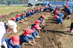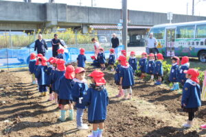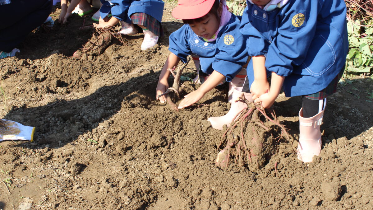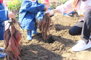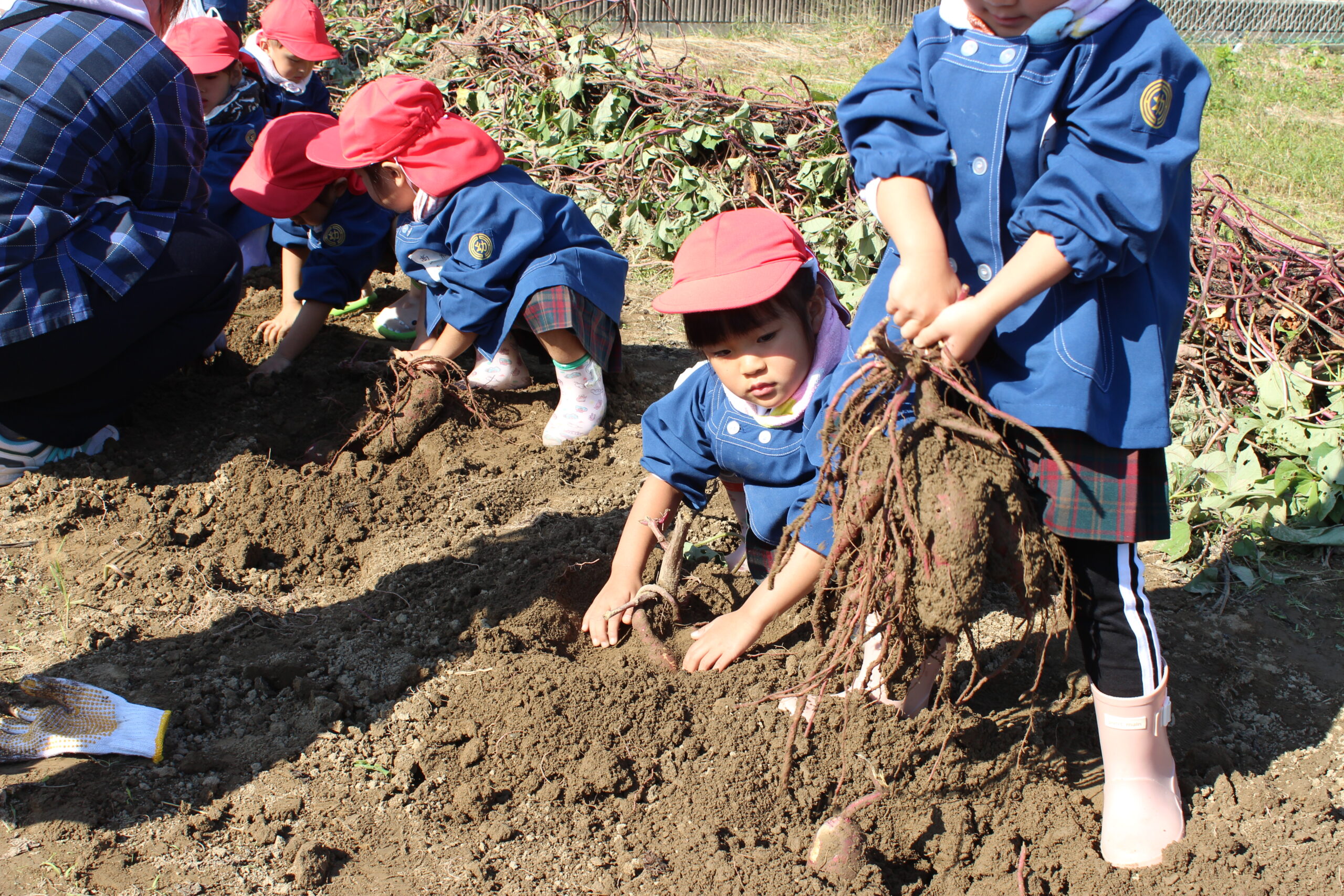 ブログ大和東幼稚園 🍠さつま芋掘り🍠 10月30日(木) 今日は朝から🌞良いお天気で。 過ごしやすい一日になりました。 そんな中、年少組が さつま芋掘りに出かけました。 畑のおじさんのお話を聞いて 頑張って土を掘り・・・ 大きなお芋を手に持って・・・ たくさんとれました。 園に帰ってからも 自分のビニール袋をみて うれしそうな子ども達でした。