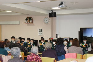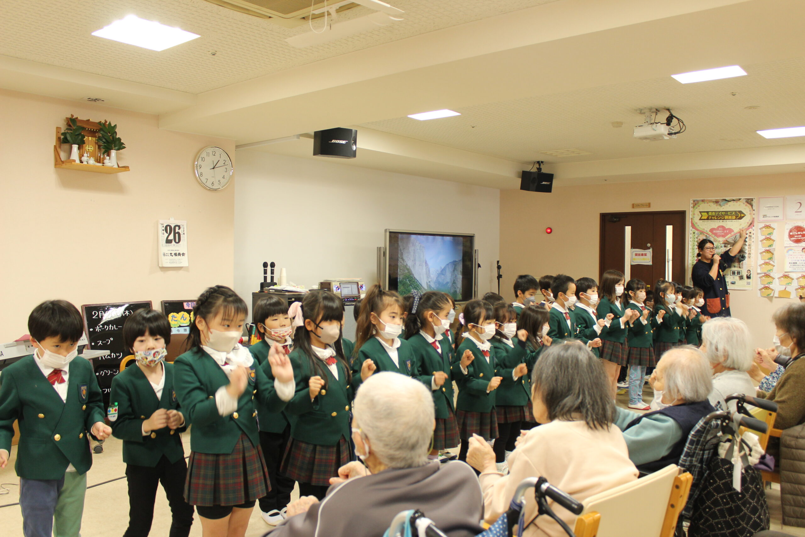 ブログ大和東幼稚園 🚌施設訪問💖 2月26日(木) 今日は、年長組が 今年度最後の施設訪問に 出かけました。 発表会で行ったミュージックベルを 披露したり 手あそびや季節の歌をうたったりして 楽しい時間を過ごしました。 最後に、みんなで“ふるさと”の 大合唱!! とても感動しました。